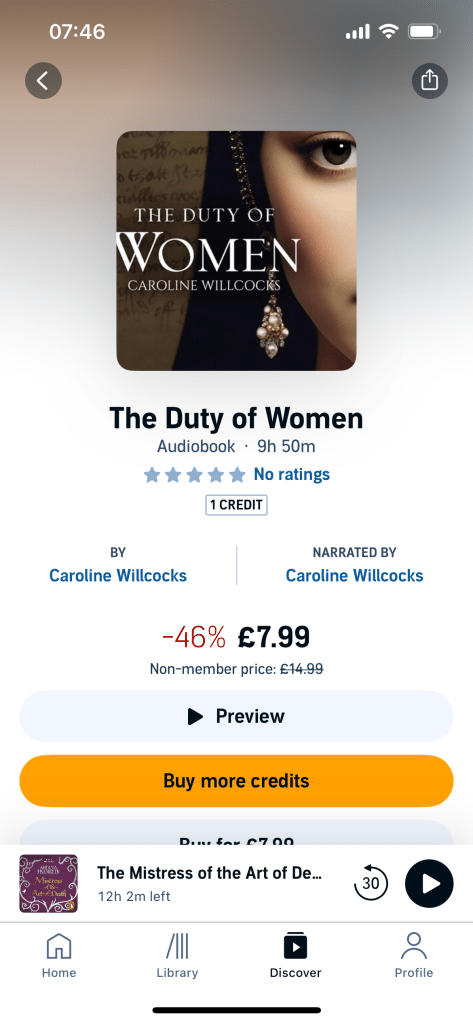 And… I’m going into the audiobooks market. So if you’re a member of Audible you can get OF ARAGON and THE DUTY OF WOMEN with one of your credits, or if you’re not a member you can buy them straight off.